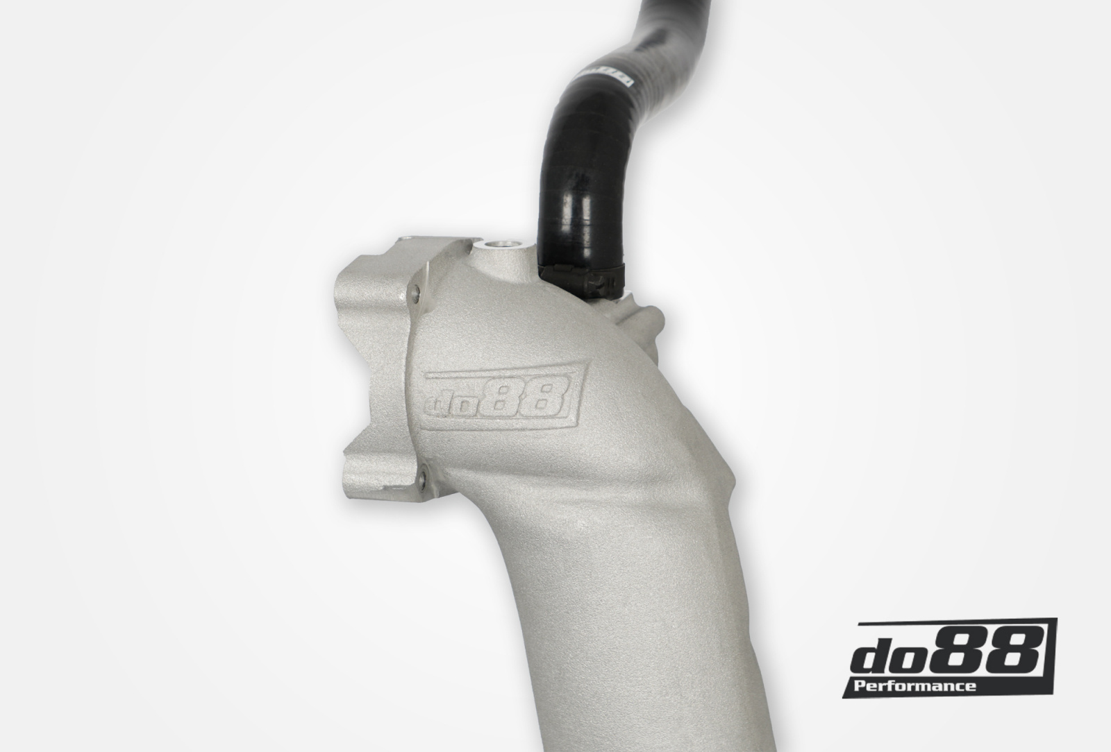 Auf der heißen Seite (Turbo->Ladeluftkühler) bietet unser Kit ein großes 70mm (2 ¾") Aluminium-Einlassrohr, das nicht das restriktive flache Design zwischen dem Motor und dem inneren Radhaus aufweist, wie bei dem OEM-Rohr. Auf der kalten Seite (Ladeluftkühler->Drosselklappe) läuft unser gegossenes Aluminium-Auslassrohr vom Drosselklappenkörper bis zum Auslass des Ladeluftkühlers. Dieses Rohr hat eine riesige 86mm Schlauchverbindung zum Ladeluftkühler im Vergleich zu den 64mm des OEMs. Diese Verbindung entspricht dem Innendurchmesser der großen 80mm Schlauchverbindung des do88 Performance Ladeluftkühlers. Das Rohr verfügt außerdem über zwei CNC-gefräste 1/8 NPT-Anschlüsse, perfekt für Methanol-Injektionen oder Ausgänge für beispielsweise Ladedrucksensoren.