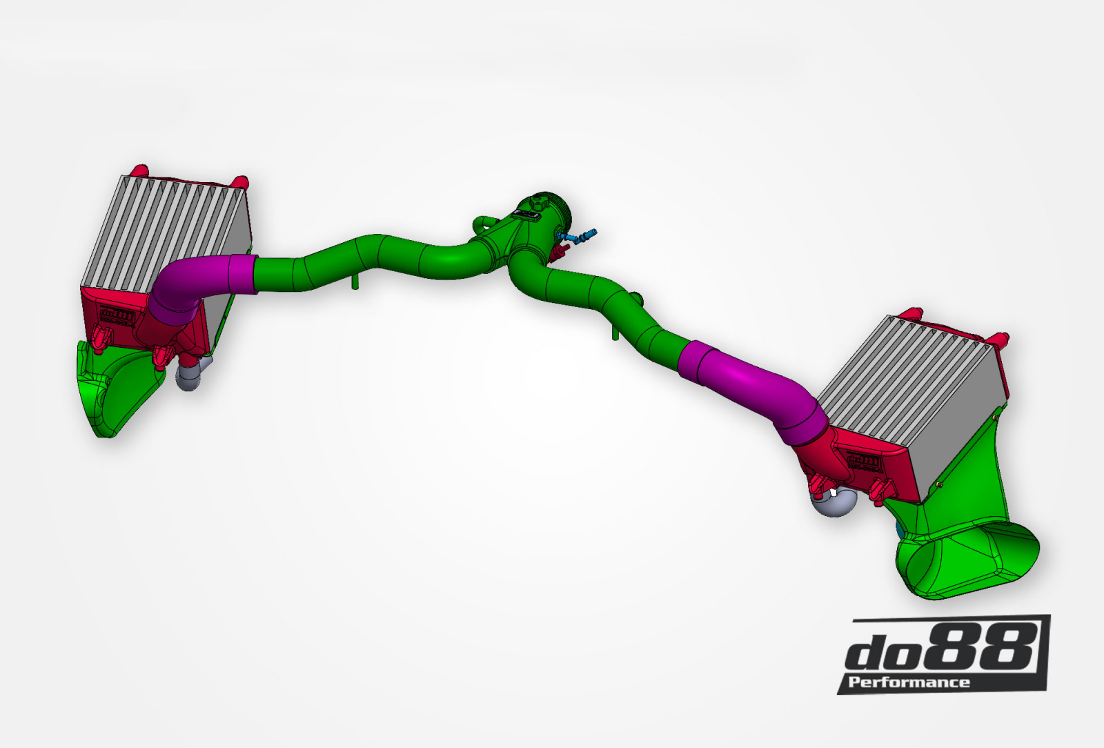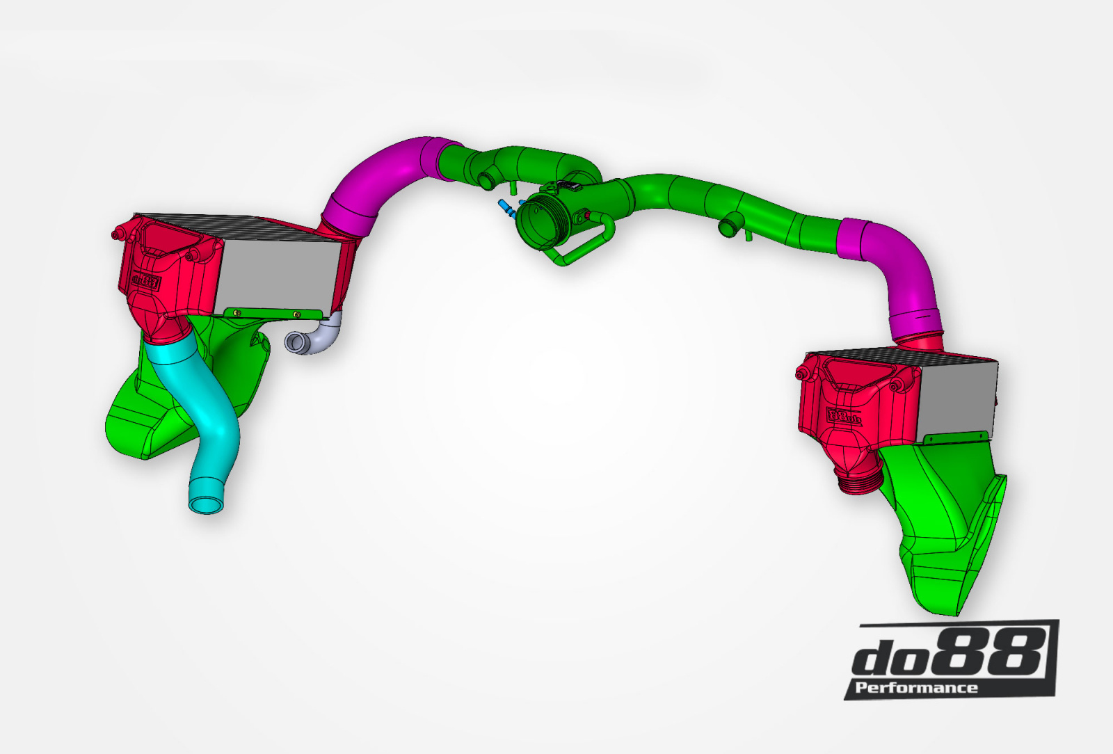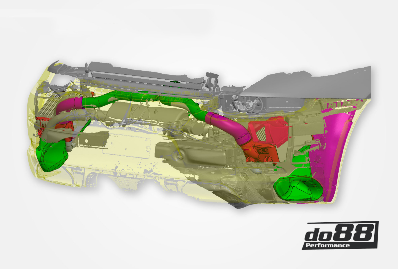 Um den Durchfluss über den gesamten Kern optimal zu verteilen, verwenden wir Gussbehälter mit strömungsoptimierten Formen. Ein gut gestalteter Behälter ist entscheidend, um die Wärmeübertragungseigenschaften und den Durchfluss zu maximieren. Der Durchfluss und die Kühlleistung hängen direkt von den Abmessungen des Kerns ab. Um einen möglichst dicken Kern verwenden zu können, haben wir die oberen Luftführungen durch Kohlefaserführungen ersetzt. Diese wurden von do88 auf Basis von 3D-Scans entwickelt und garantieren eine hervorragende Passgenauigkeit sowohl zur Karosserie des Fahrzeugs als auch zu unseren großen Ladeluftkühlern.