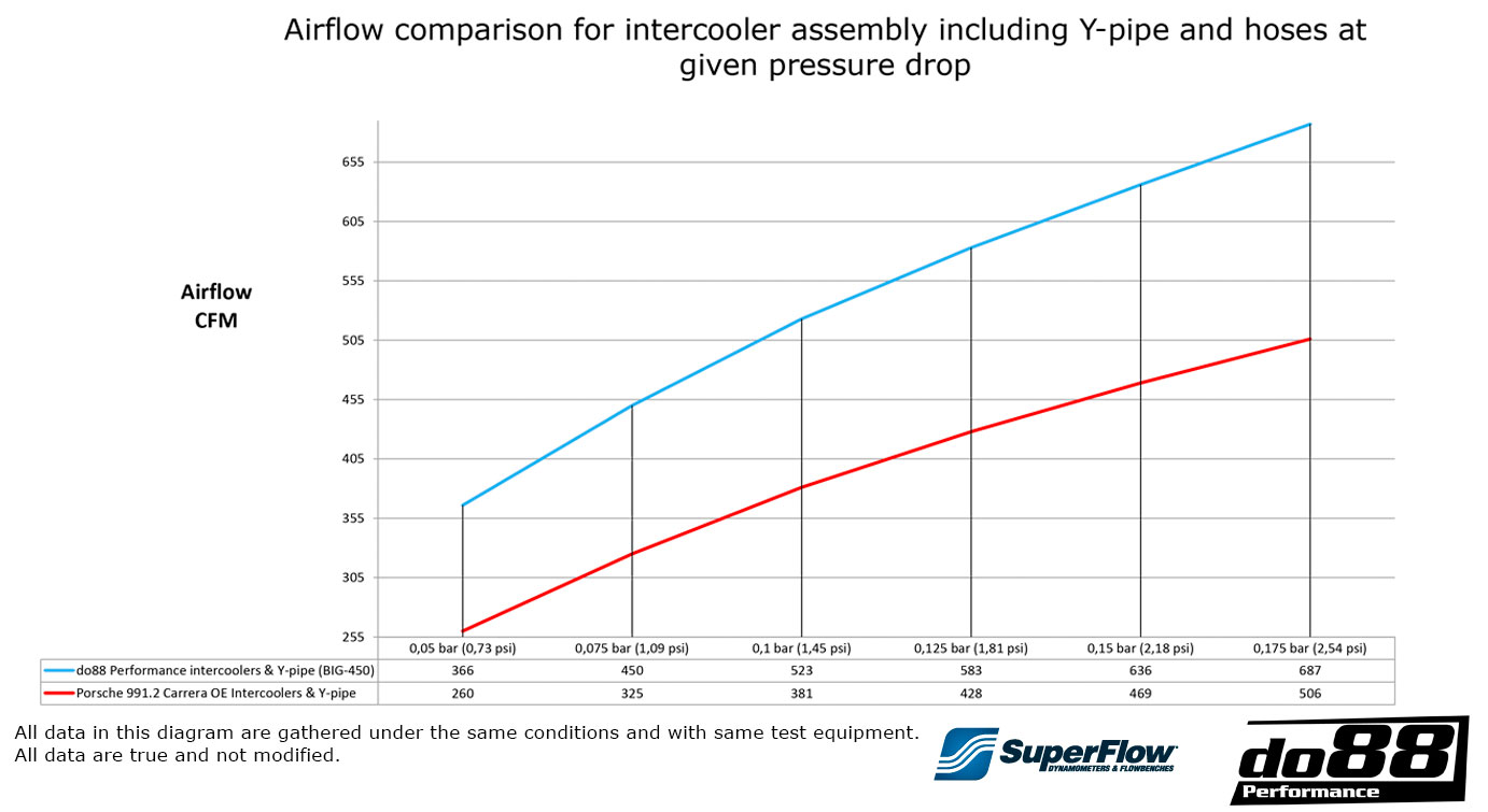 Kühlung ist wichtig, und auch der Luftstrom. Nach vielen Stunden der Entwicklung, Verfeinerung der Endtanks und Wahl eines Kerns, der unseren Anforderungen entspricht, ist das Ergebnis ein Ladeluftkühler, der in Bezug auf Wärmeübertragung und Luftstrom viel effizienter ist. Mit unserem hauseigenen Superflow SF-1020 Probench wird der Luftstrom als vollständiges System mit Schläuchen sowohl am Einlass als auch am Auslass für sowohl die OEM-991-Ladeluftkühler als auch die do88-Performance-Ladeluftkühler verifiziert.