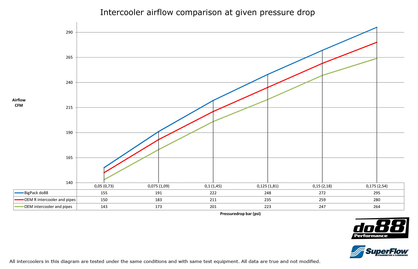Ein gewöhnliches Missverständnis ist, dass man mit einem Ladeluftkühler in dieser Position keinen guten Kühleffekt erreicht und dass ein Ladeluftkühler, der an der Vorderseite montiert wird (FMIC), besser wäre. Tatsächlich ist das BigPack von do88 bei weitem besser als die meisten FMIC-Installationen, die aufgrund des Platzmangels eine weitaus kleinere Kühlfläche haben und bei denen häufig die Luftzufuhr durch z. B. Stoßfänger blockiert wird, sodass deren Kühleffekt häufig sogar schlechter ist als die des Originalkühlers.