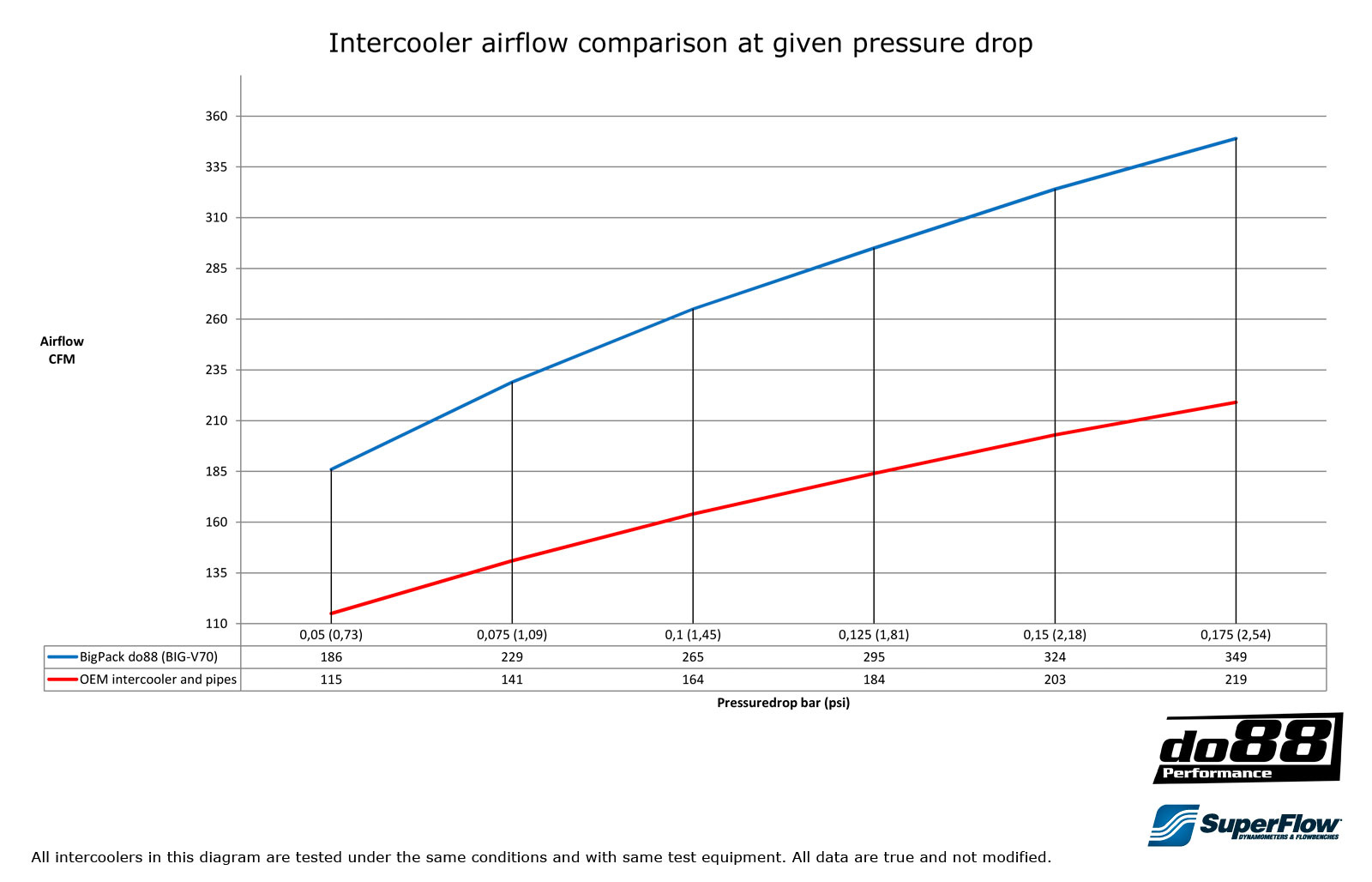 Ein gewöhnliches Missverständnis ist, dass man mit einem Ladeluftkühler in dieser Position keinen guten Kühleffekt erreicht und dass ein Ladeluftkühler, der an der Vorderseite montiert wird (FMIC), besser wäre. Tatsächlich ist das BigPack von do88 bei weitem besser als die meisten FMIC-Installationen, die aufgrund des Platzmangels eine weitaus kleinere Kühlfläche haben und bei denen häufig die Luftzufuhr durch z. B. Stoßfänger blockiert wird, sodass deren Kühleffekt häufig sogar schlechter ist als die des Originalkühlers.