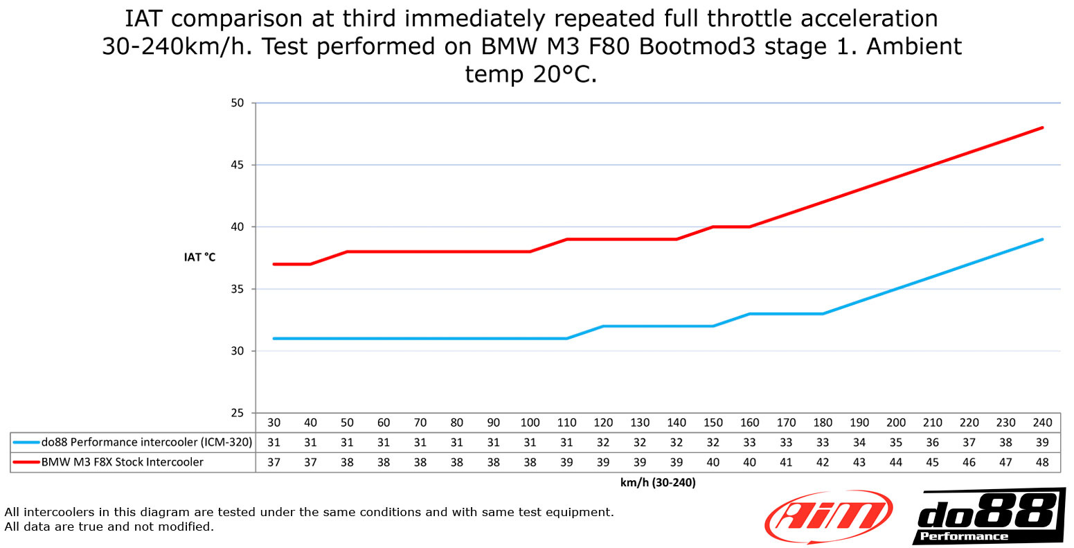 Unsere Mission bei der Entwicklung dieses neuen Performance-Ladeluftkühlers bestand darin, die Schwächen des OE-Ladeluftkühlers zu beseitigen und natürlich eine große Leistungssteigerung zu bieten. Bei allen Tests, die wir während der Entwicklung unserer gesamten BMW F8X M2C/M3/M4-Produktreihe durchgeführt haben, sehen wir deutlich, wie die Spitzenleistung direkt mit der IAT (Intake Air Temperature) zusammenhängt.