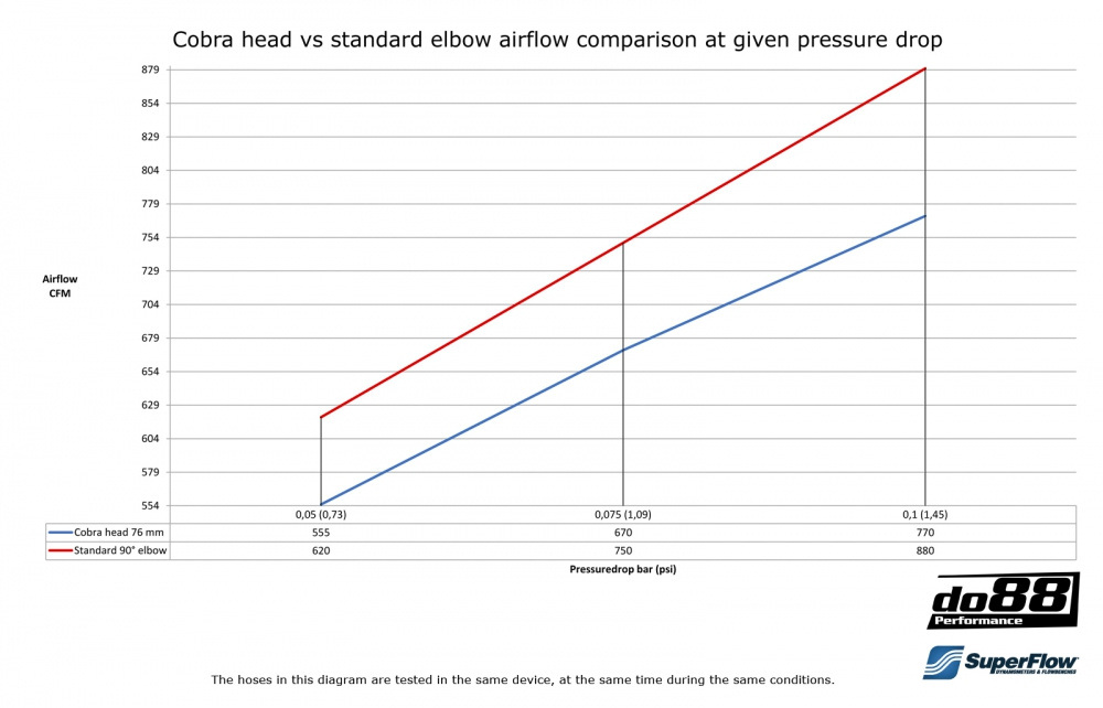 Ein von do88 entwickelter Spezialschlauch für einen hohen Durchfluss zum Ansaugtrakt, Turboeinlass usw., der an einer Stelle sitzt, wo ein herkömmlicher Silikonbogen zu viel Platz wegnehmen würde. Bei wenig Platz kann man vorzugsweise diesen Schlauch verwenden, der mit seinem cleveren Design guten Durchfluss trotz enger Radien garantiert. Siehe extra Bild mit einer Darstellung des geringen Platzverbrauches um den Anschluss, an dem der Schlauch angebracht wird.