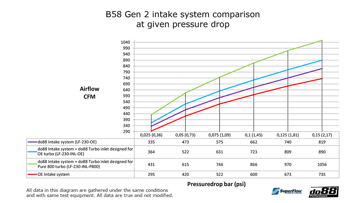 Tests, die auf unserem SuperFlow SF1020 Strömungsprüfstand durchgeführt wurden, zeigen deutlich die Bedeutung dieses optionalen Turbo Einlassrohrs. Das Ansaugsystem allein bietet eine erhebliche Steigerung des Luftstroms um 15 %. In Kombination mit dem do88 Turbo Einlassrohr (für OE Turbo) steigt der gesamte Luftdurchsatz um beeindruckende 23 %! Wir empfehlen diese Kombination nachdrücklich.