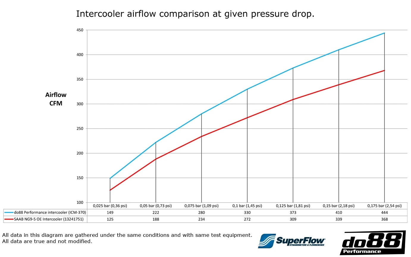 Das um 81% erhöhte Netzvolumen ist eine Leistung, auf die wir stolz sind. Es ist ein bemerkenswerter Unterschied. Der Motor zieht besser über das gesamte Leistungsband und hält wiederholte Vollgasläufe aus, ohne Hitze aufzubauen. Die Vorstellung, dass ein Ladeluftkühler nur nach einer großen Motortuningaktion aufgerüstet werden sollte, ist falsch, aber unter Kunden und Autoliebhabern weit verbreitet. An heißen schwedischen Sommertagen, bei wiederholten Beschleunigungen, inspiriertem Fahren oder sogar bei normalem Fahren in einem heißeren Klimabereich, bedarf es nicht viel Anstrengung vom Motor, um gefährlich hohe Einlasstemperaturen zu erzeugen - selbst bei einem standardmäßigen, nicht getunten Auto. Die Kühlkapazität mit einem OE-Ladeluftkühler ist in vielen Fällen minderwertig, was die nutzbare Leistungsabgabe beeinflussen wird. Die Wärme muss beseitigt werden, sonst wird die versprochene Leistung nicht zur Verfügung stehen, wenn Sie sie benötigen. Mit unserem Ladeluftkühler können Sie sicher sein, dass die Leistung immer vorhanden ist. Darüber hinaus werden die Verbesserung des Luftstroms und die Reduzierung des Druckabfalls hinter dem Lenkrad bemerkt. Mehr Luft in den Motor bringt mehr Leistung - Bingo!