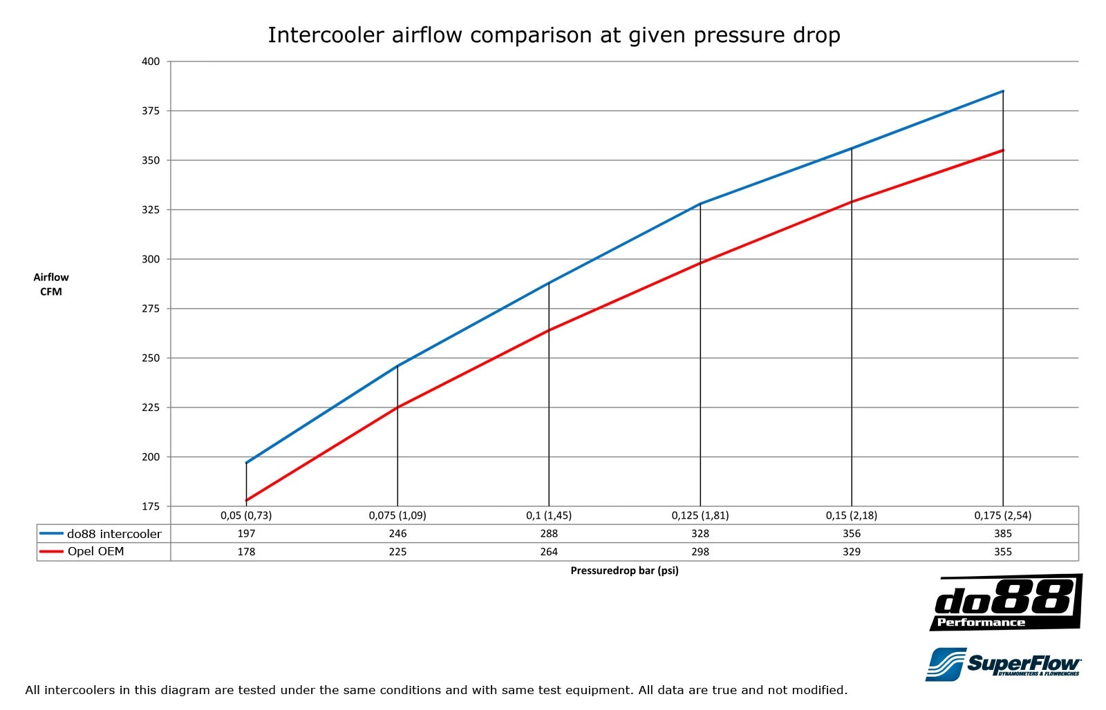 Ein gewöhnliches Missverständnis ist, dass man mit einem Ladeluftkühler in dieser Position keinen guten Kühleffekt erreicht und dass ein Ladeluftkühler, der an der Vorderseite montiert wird (FMIC), besser wäre. Tatsächlich ist der Hochleistungsladeluftkühler von do88 bei weitem besser als die meisten FMIC-Installationen, die aufgrund des Platzmangels eine weitaus kleinere Kühlfläche haben und bei denen häufig die Luftzufuhr durch z. B. Stoßfänger blockiert wird, sodass deren Kühleffekt häufig sogar schlechter ist als die des Originalkühlers.
