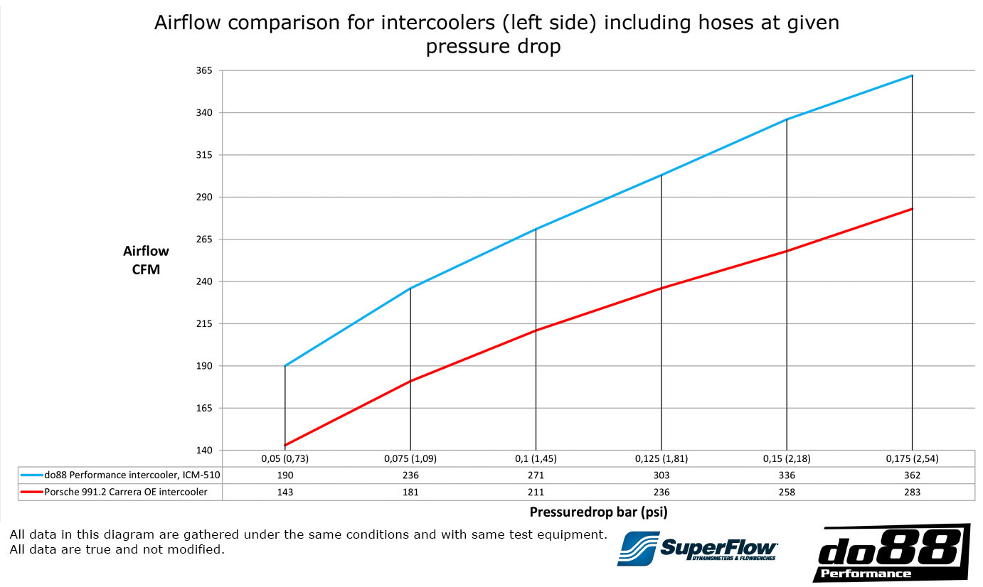 Kühlung ist wichtig, und auch der Luftstrom. Nach vielen Stunden der Entwicklung, Verfeinerung der Endtanks und Wahl eines Kerns, der unseren Anforderungen entspricht, ist das Ergebnis ein Ladeluftkühler, der in Bezug auf Wärmeübertragung und Luftstrom viel effizienter ist. Mit unserem hauseigenen Superflow SF-1020 Probench wird der Luftstrom als vollständiges System mit Schläuchen sowohl am Einlass als auch am Auslass für sowohl die OEM-991-Ladeluftkühler als auch die do88-Performance-Ladeluftkühler verifiziert.