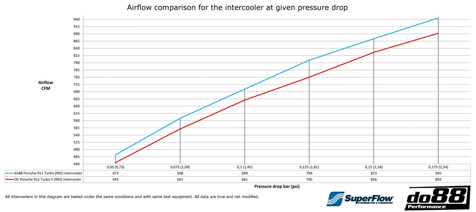 Kühlung ist wichtig, und das gilt auch für den Luftstrom. Nach vielen Stunden in der Entwicklung, bei der Verfeinerung der Endtanks und der Wahl eines Kerns, der unseren Anforderungen entspricht, ist das Ergebnis ein Ladeluftkühler, der in Bezug auf Wärmeübertragung sowie Luftstrom viel effizienter ist. Mit unserer hauseigenen Strömungsprüfstand, der Superflow SF-1020 Probench, wird der Luftstrom sowohl für die do88 Ladeluftkühler als auch für die OE 992-Einheiten überprüft. Was Sie sehen, ist was Sie bekommen - wahre Leistung!