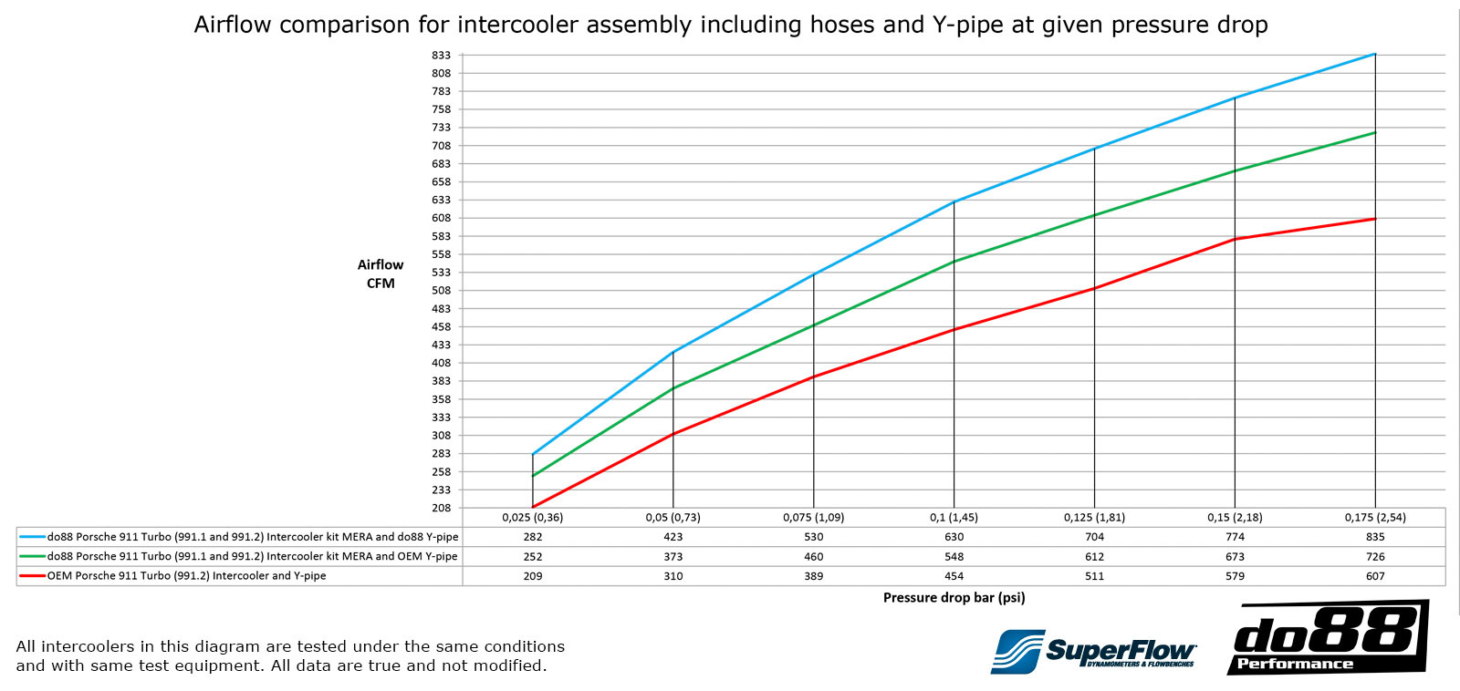 - Mehr Luft zu Ihrem Motor, weniger Gegendruck und besserer Luftstrom! Luftstrom bei 0,175 bar / 2,54 psi Druckabfall: 726 CFM (607 CFM), 19 % höher (do88 Ladeluftkühler + OE y-Rohr vs OE Ladeluftkühler + OE y-Rohr)! Siehe Diagramm unten.