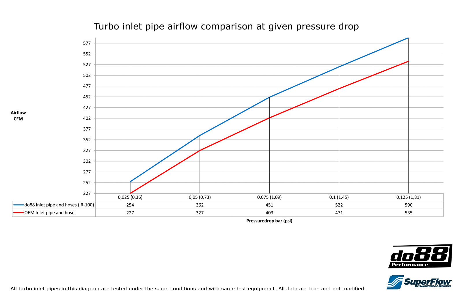 Das Kit enthält ein eigens von do88 entwickeltes Einlassrohr und Silikonschläuche. Dieses Kit ist perfekt für denjenigen, der hohe Effekte erzielen und mit dem besten Zubehör aufrüsten will! Unser Einlassrohr hat einen deutlich besseren Durchfluss als das Original, was wir sowohl mit dem Auto als auch unserer eigenen SuperFlow SF-1020 Flow Bench getestet haben. Unser Einlassrohr hat einen Außendurchmesser von 89 mm (3,5 Zoll), um alle Restriktionen zu beseitigen.