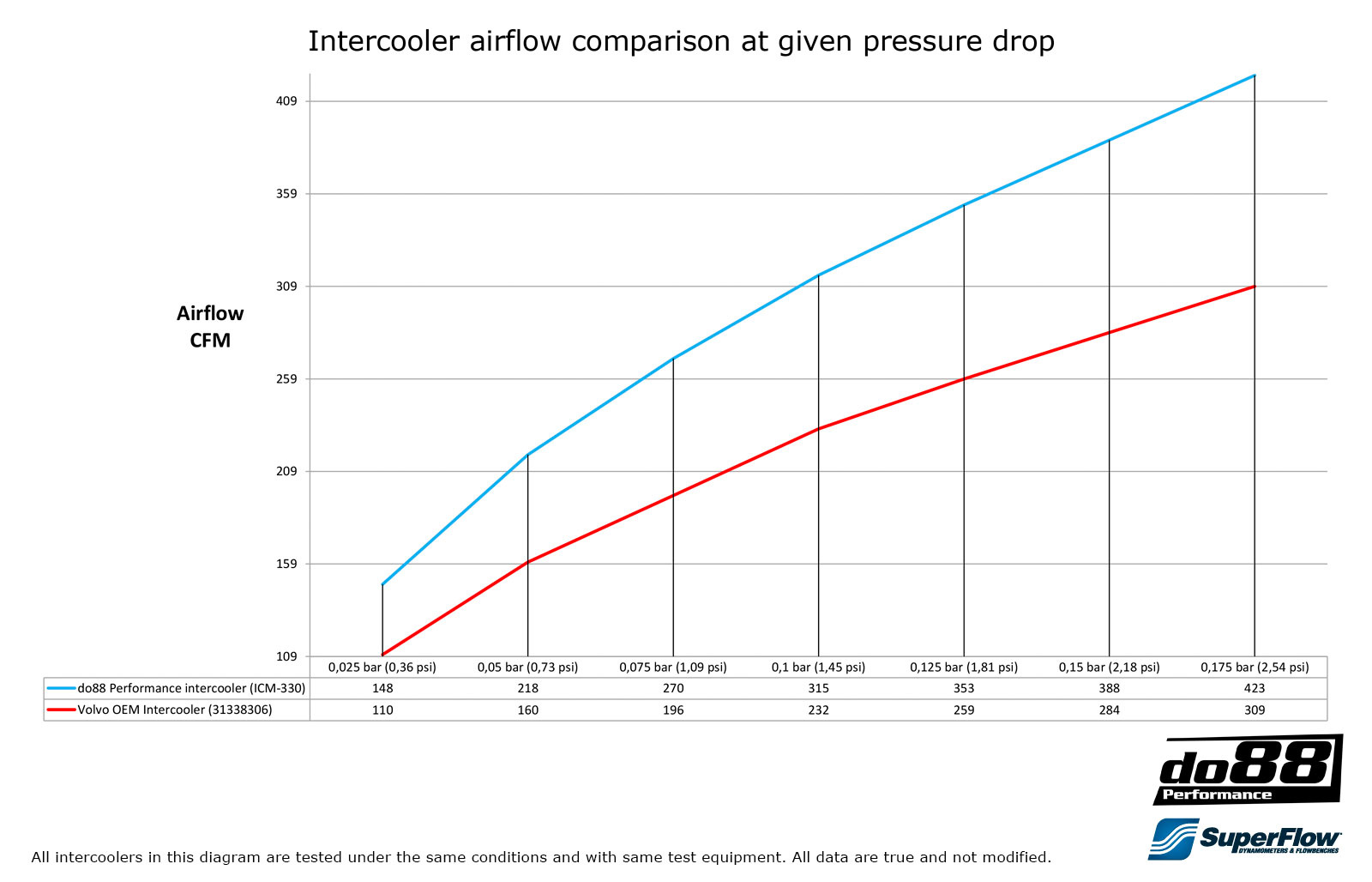 Ganze 62 % größeres Volumen ist der stolze Unterschied, den wir erzielen konnten. Dies ist wirklich merkbar. Der Motor zieht besser bei allen Geschwindigkeiten und man kann mehrmals das Gaspedal voll durchdrücken, ohne dass der Motor wärmer wird. Vielen Leute glauben, dass man den Ladeluftkühler erst bei extrem getunten Autos tauschen muss, doch das stimmt nicht. An einem warmen Sommertag, beim häufigen Anfahren, inspiriertem Fahren oder einfach nur wärmerem Klima braucht es nicht viel, bevor die Motortemperaturen gefährlich hoch werden, auch bei Autos, die nicht getunt sind. Die Kühlleistung von Standardladeluftkühlern ist in vielen Fällen schlecht und beeinflusst den Motor und dessen Stärke. Die Wärme muss weg, ansonsten sinkt der versprochene Effekt drastisch, sobald man Gas gibt. Mit diesem Ladeluftkühler kann das Auto garantiert immer die volle Leistung bringen.